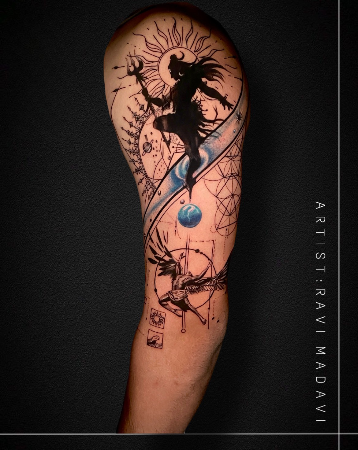 The Divine Cosmic Shiva Tattoo by Miirror Tattoo is an extraordinary blend of spirituality, symbolism, and artistic brilliance. Featuring the powerful silhouette of Lord Shiva, it radiates cosmic energy and portrays his role as both creator and destroyer of the universe. The radiant sun and sacred geometric patterns represent balance, harmony, and the eternal cycle of existence. Flowing design elements merge seamlessly with the vibrant Earth, signifying the deep connection between divinity and human life. This masterpiece is more than body art—it’s a spiritual statement, reflecting inner strength, cosmic balance, and the eternal energy that guides the soul.