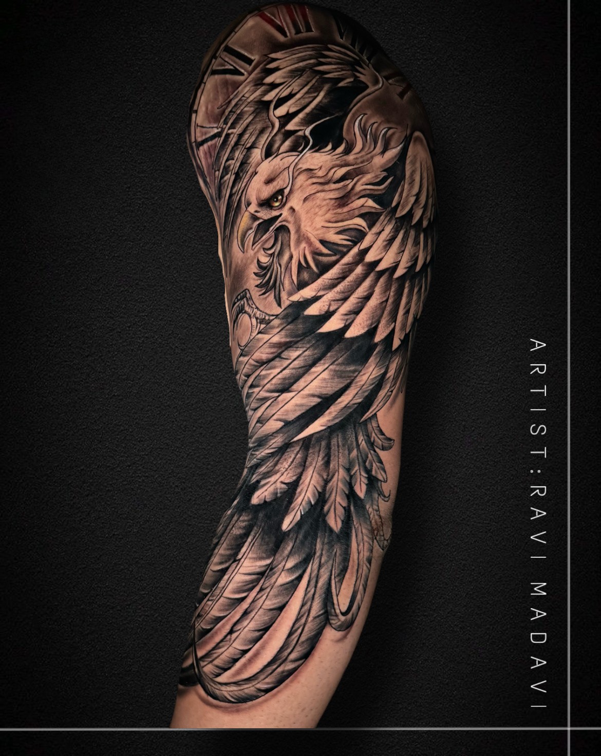 The Majestic Eagle Sleeve Tattoo by Miirror Tattoo is a stunning piece of art that embodies strength, vision, and the spirit of freedom. Known as a symbol of courage and determination, the eagle represents the ability to rise above challenges with focus and resilience. Each feather in this design is crafted with intricate detailing, adding depth and realism, while the fierce expression captures the raw, untamed energy of the bird. The addition of clock elements and fine shading further enhances the tattoo, symbolizing the harmony between time, patience, and persistence. This masterpiece not only showcases remarkable craftsmanship but also reflects inner power, determination, and the will to soar higher in life, making it an inspiring statement for the wearer.